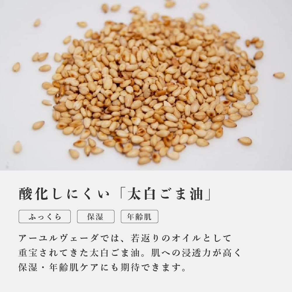 アーユルヴェーダでは、若返りのオイルとして重宝されてきた太白ごま油。肌への浸透力が高く保湿・年齢肌ケアにも期待できます。